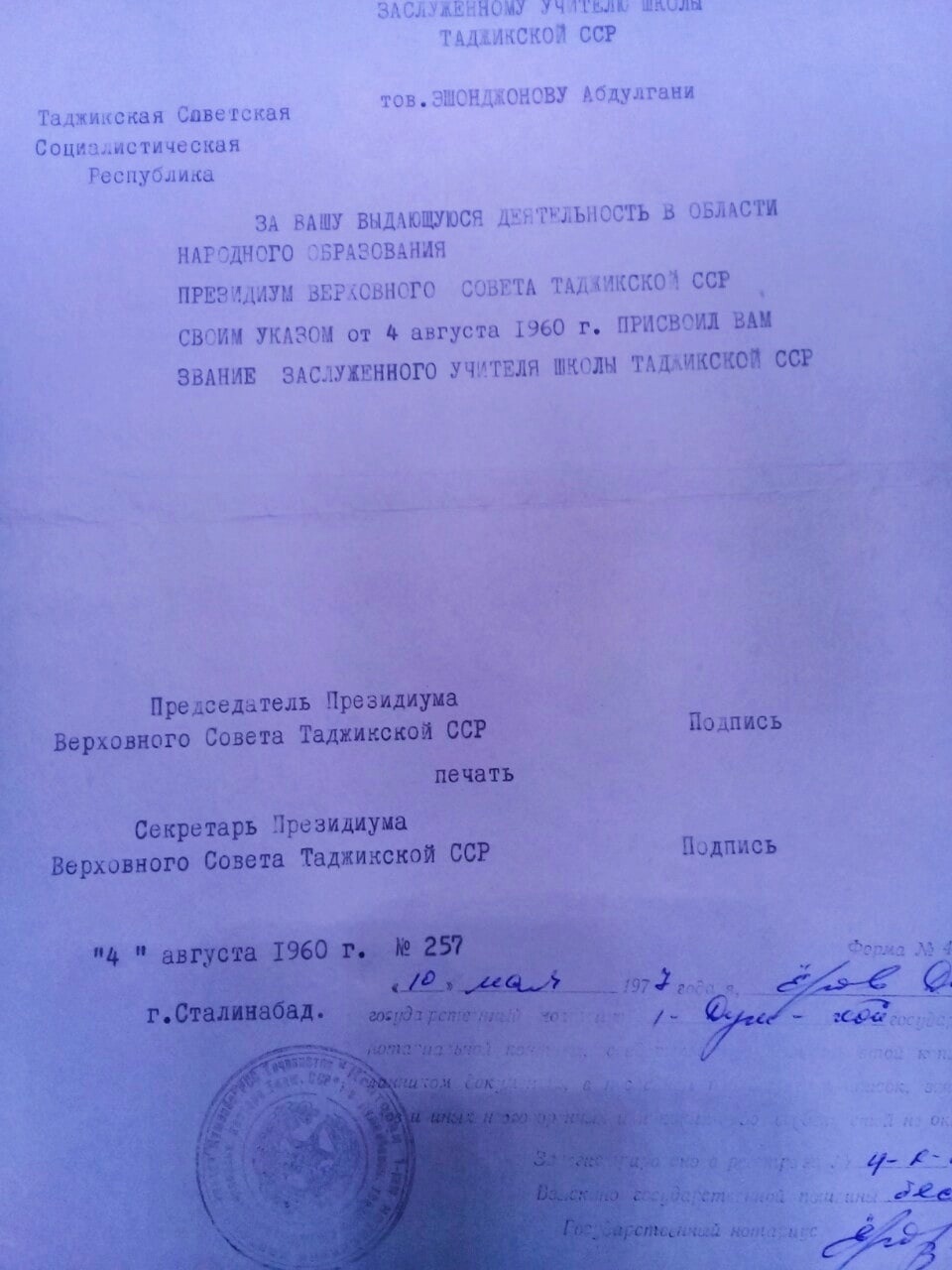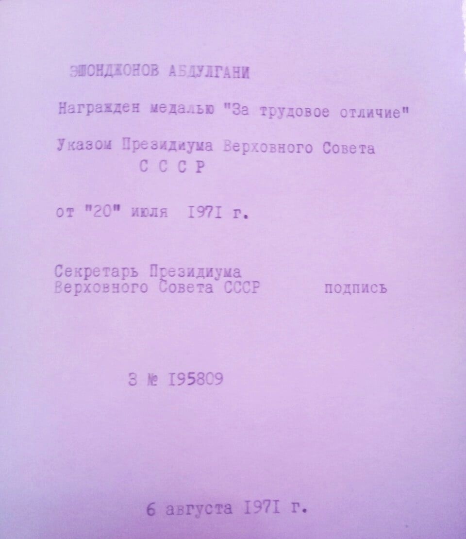 - Указом Президиума Верховного Совета Таджикской ССР от 4 августа 1960 г. присвоено почетное звание «Заслуженного учителя школы Таджикской ССР».
