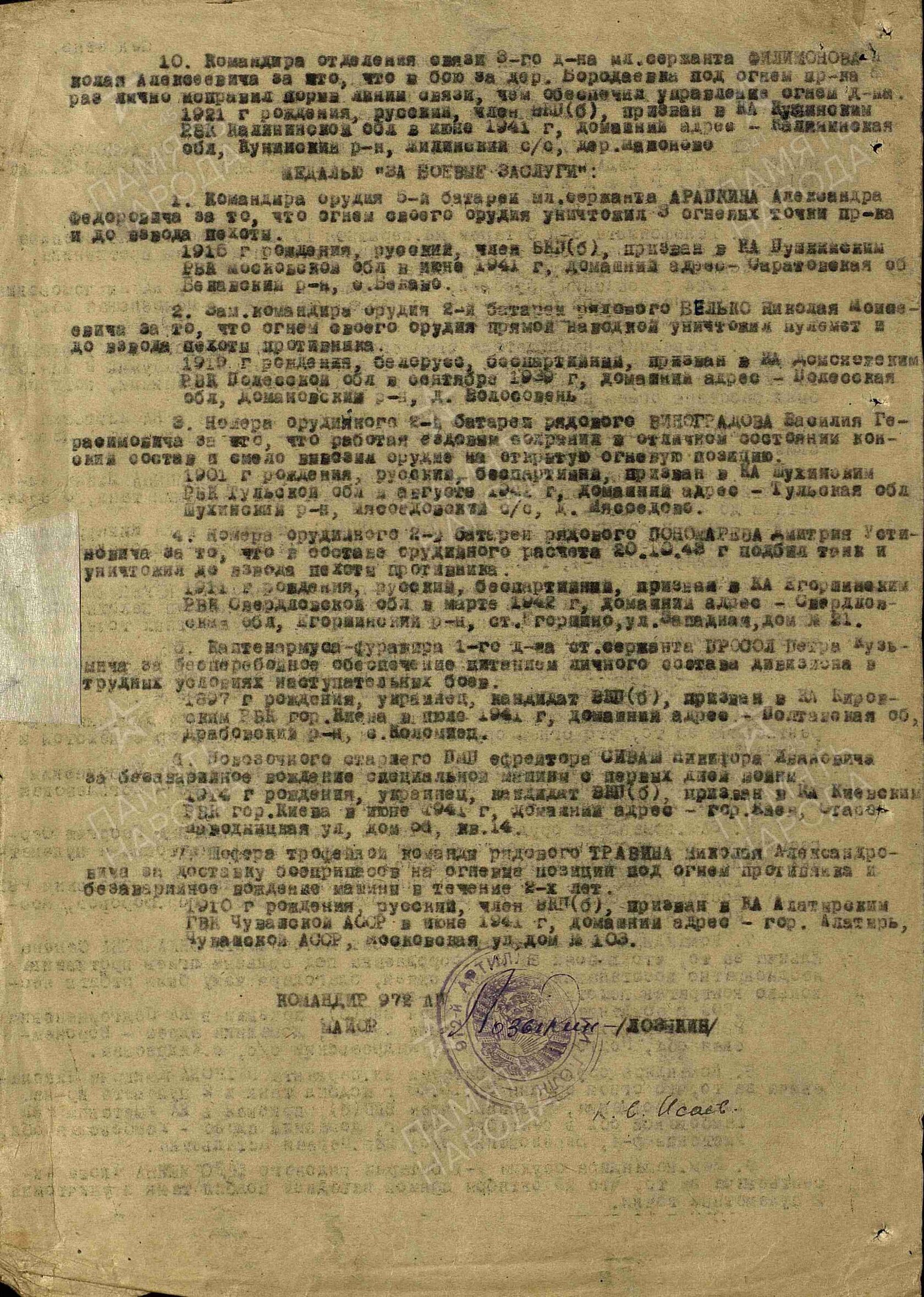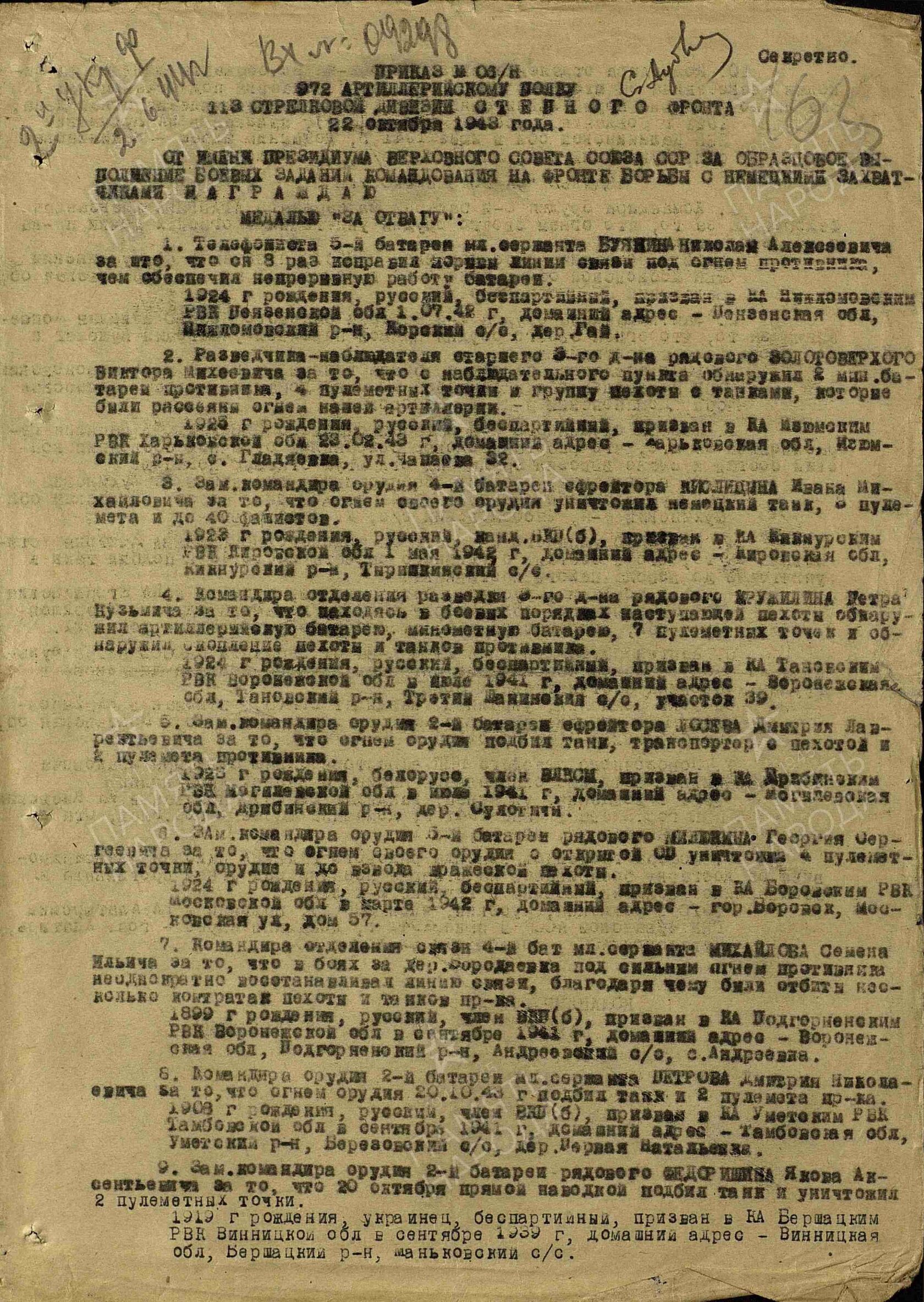 Воинская часть: 972 артиллерийский полк 113 стрелковой дивизии (II), до 26.9.41 - 5 Московской стрелковой народного ополчения.