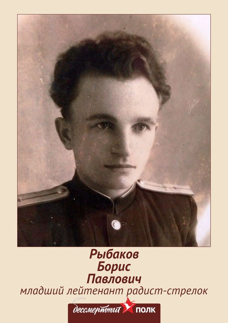 Мой отец, Рыбаков Борис Павлович, родился 9 февраля 1927 года в г. Гжель Московской области. Перед самой Великой Отечественной войной вся семья переехала в г.Железнодорожный (тогда он назывался Обираловка). Наш дом стоял на месте гимназии, где сейчас учатся мои две внучки (улица называлась Майской).